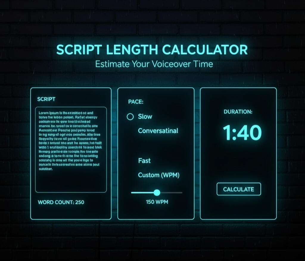 A Script Length Calculator (also known as a Words-to-Time Calculator or Script Timer) is an essential tool for voiceover artists, video producers, and anyone working with spoken content.What It IsIt's a simple utility that converts the word count of a script into an estimated audio duration (time in minutes and seconds).Why It's CrucialProject Planning: It allows you to quickly determine if your script is too long or too short for a specific time slot (e.g., a 30-second commercial or a 5-minute explainer video). This saves huge amounts of time in production and editing.BudgetingVoiceover artists and producers use the estimated duration to accurately quote for recording sessions and manage studio time efficiently.